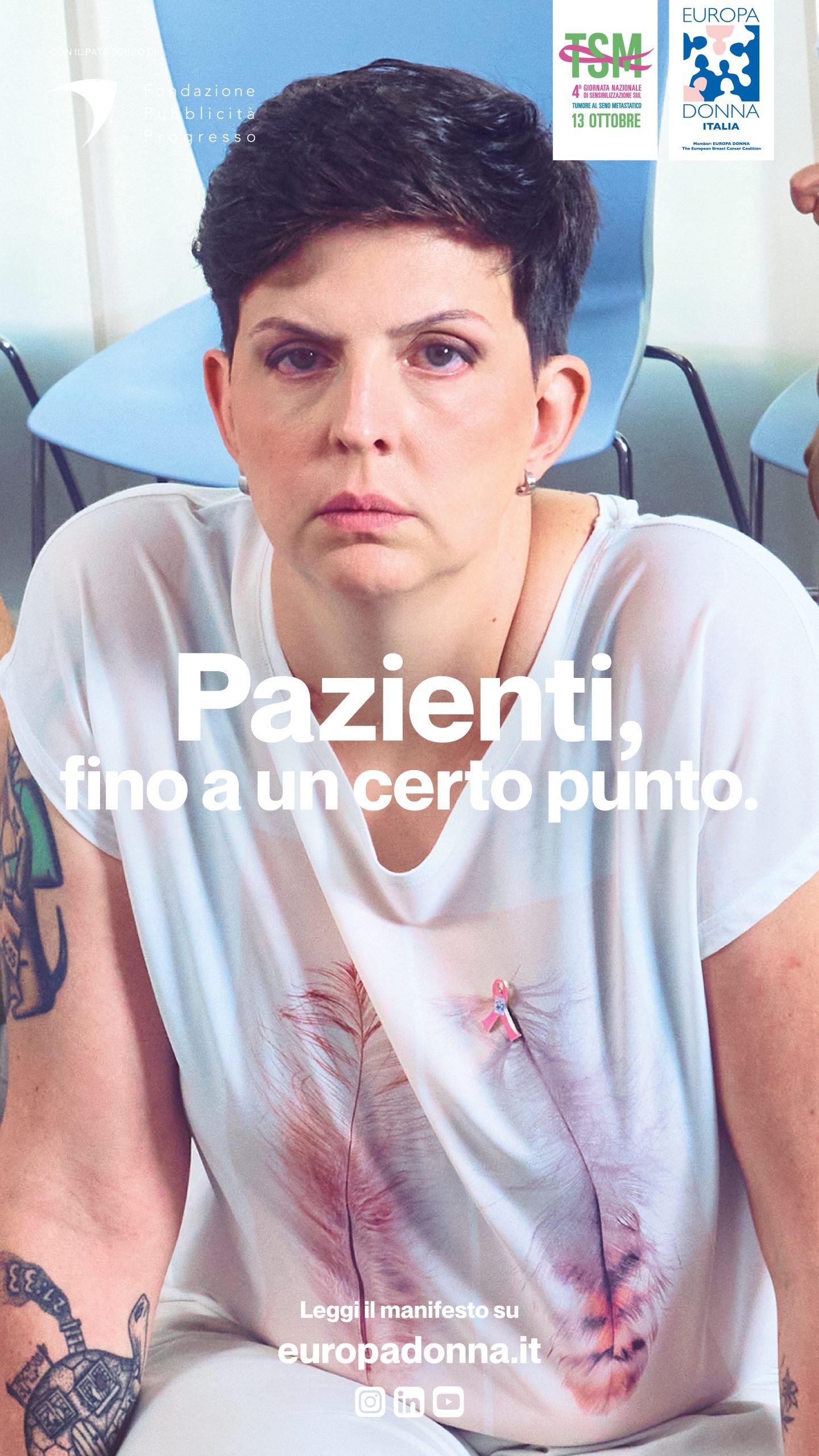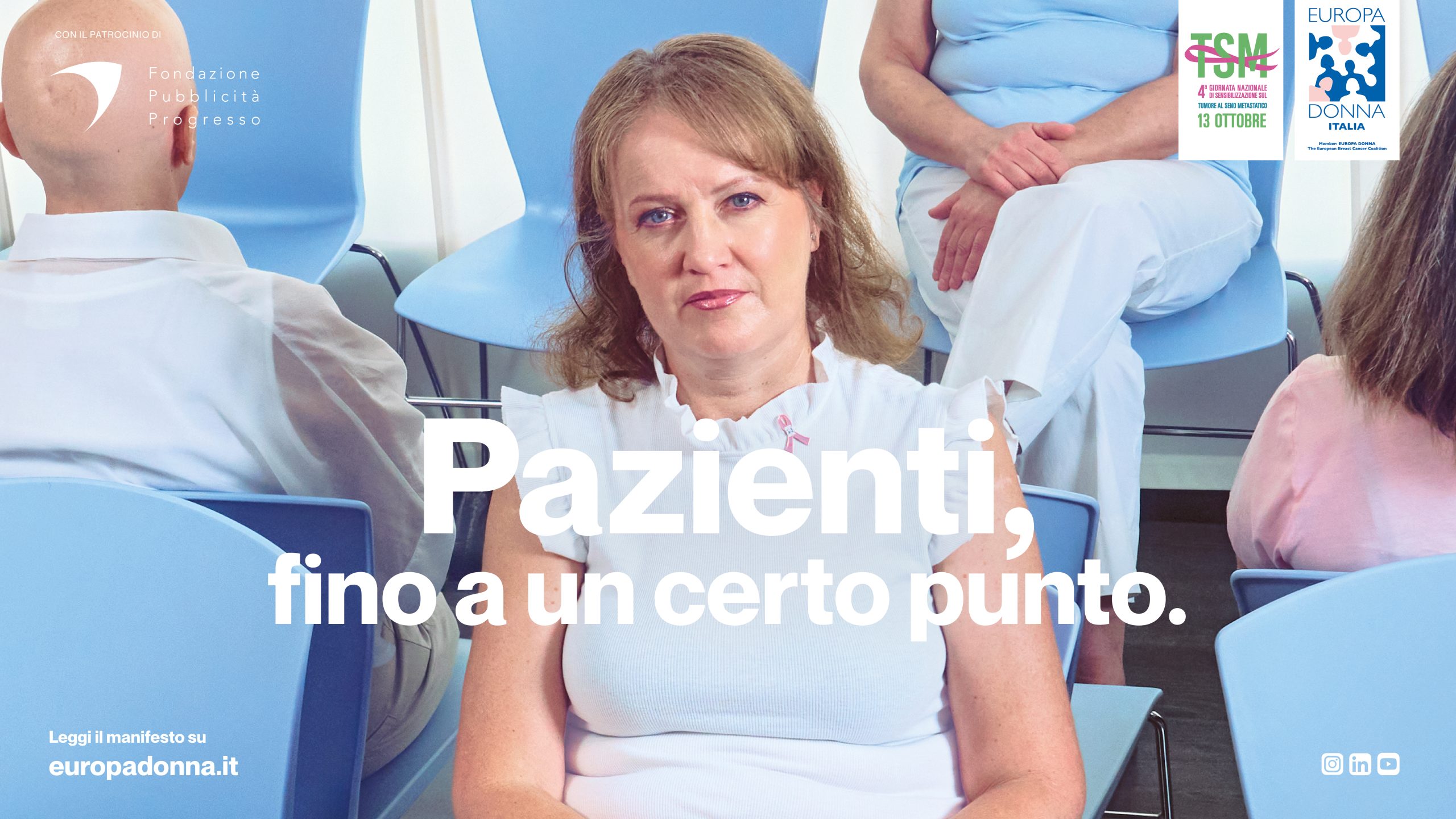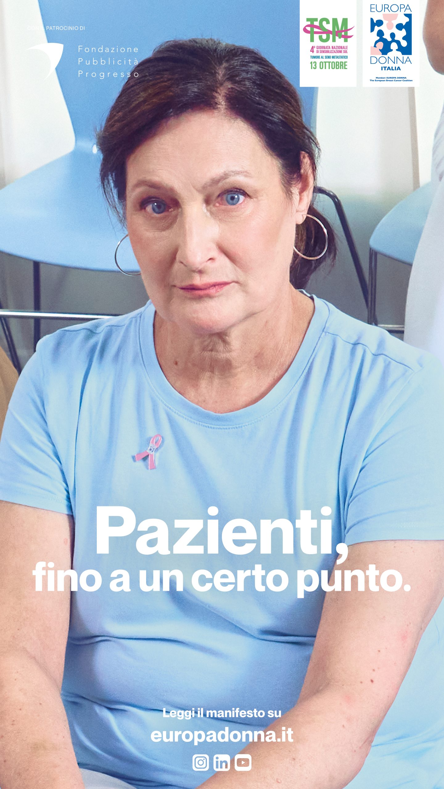 Per il quarto anno consecutivo siamo al fianco di Europa Donna Italia, presieduta da Rosanna D’Antona, per la campagna di sensibilizzazione sul tumore al seno metastatico, intitolata “Pazienti, fino a un certo punto”. Dopo “Una voce per tutte”, “Una volta per tutte” e “Non c’è tempo da perdere”, il percorso di collaborazione con Europa Donna Italia prosegue con una nuova campagna dal titolo “Pazienti, fino a un certo punto”. Un messaggio forte, diretto, che gioca sul doppio significato della parola “pazienti”: donne che affrontano ogni giorno la malattia con forza e dignità, ma che non possono più aspettare.